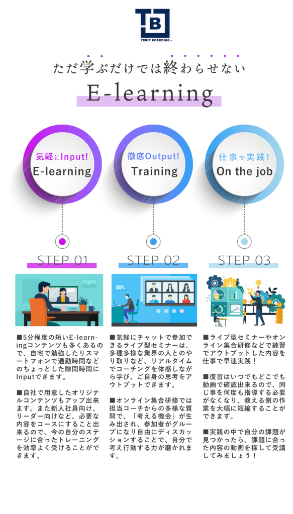 Eーニングで学んでいただいた後は、さらにオンラインのライブ型セミナーへの参加や、他社との意見交換などもできるオンライン集合研修にご参加いただき、更なる学びを深めていただくことができます。そして、なんと社外コーチのコーチングも受けることが可能です。