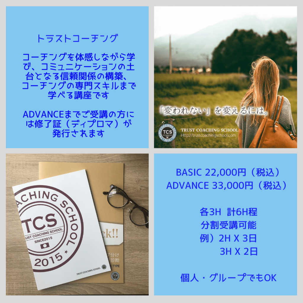 ※テキスト手配が必要となる、トラストコーチング、マザーズコーチング(ペアレンツ)、パートナーシップコーチングにつきましては、ご受講希望日の10日以上前よりご予約ください。