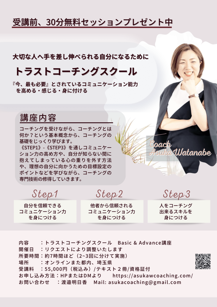 トラストコーチングでは、自分自身を信頼出来ていないのに、相手から信頼されることは出来ないし、ましてやコーチング、相手を応援(大切にする)ことも出来ないと考え、