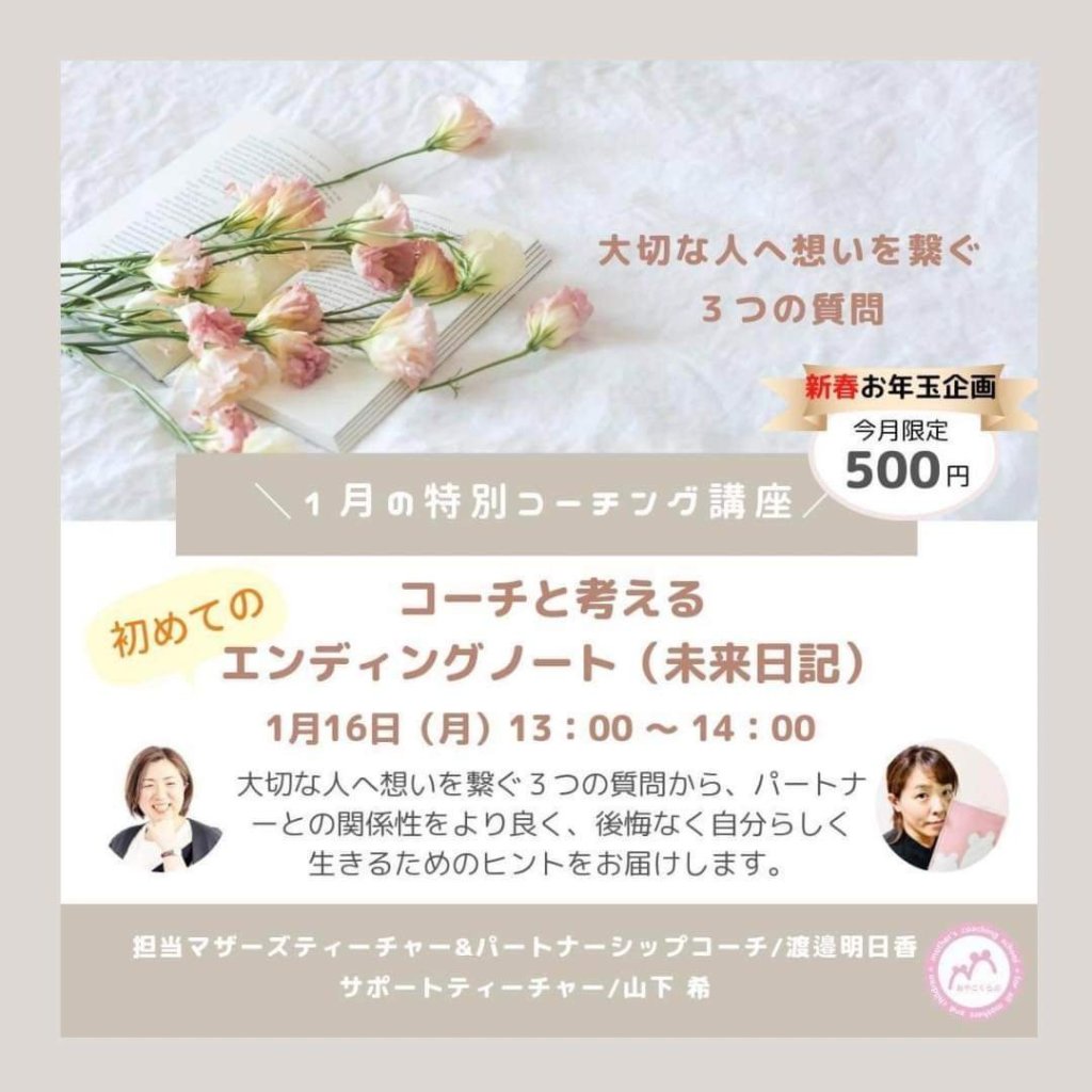 誰でも必ず来る、大切な人との最後の日を一つのゴールとして捉え、コーチングの視点からより良い未来に向けて、これまでに考えたことのない『3つ質問』から考えていく時間です。