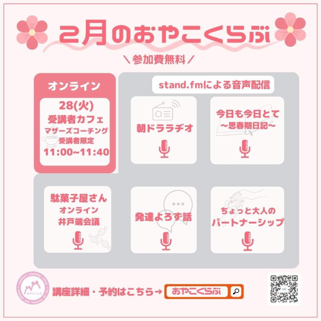マザーズコーチングスクールに所属する認定マザーズティーチャーが有志で集まり、コーチング講座や親子で参加できるイベントを開催しているマザーズコーチングスクール公式コミュニティです。 私はこちらにて、音声配信(ラジオ)や、特別コーチング講座を担当しています。 どんな音声配信や講座があるのかは おやこくらぶHPをご覧ください。