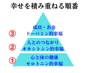 まずは健康第一、そして、身近な人間関係、そこが安定してやっと、③成功、お金に進むことができます。
